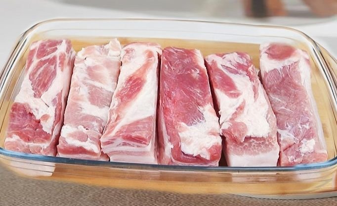 Ретельно промийте грудинку та розріжте її на великі шматки.