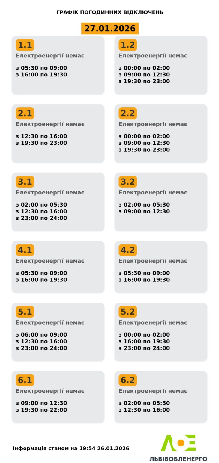 Графіки вимкнення світла на вівторок, 27 січня