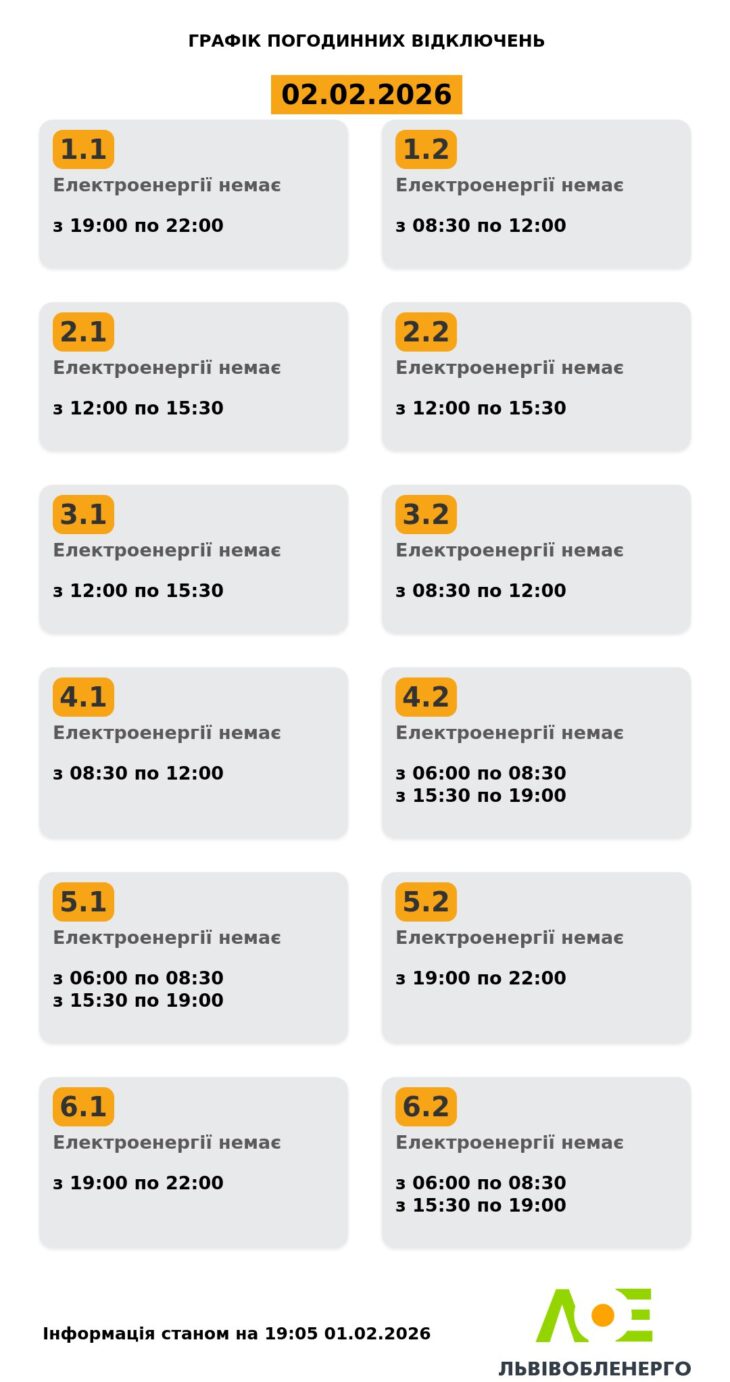 Графік вимкнення світла на понеділок, 2 лютого, на Стрітення