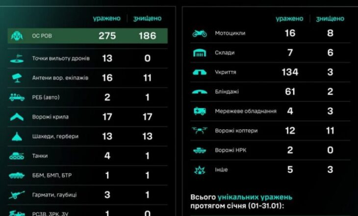 Інфографіка СБС ЗСУ Усього протягом доби підрозділами угруповання СБС уражено/знищено 591 ціль противника. Про це вранці 1 лютого повідомили Сили безпілотних систем ЗСУ. Серед уражених цілей: 275 одиниць особового складу, […]