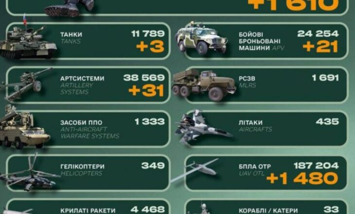 За минулу добу російська армія втратила на війні проти України ще 1610 військових, 31 артилерійську систему, 21 бойову броньовану машину і 3 танки. Про це повідомили у Генштабі. З 24 […]