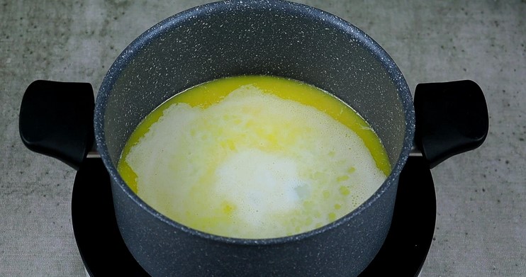 - Спершу зробимо заварне тісто. У каструлю наливаємо воду і викладаємо вершкове масло. Мало повинно повністю розчинитись і почати закипати.