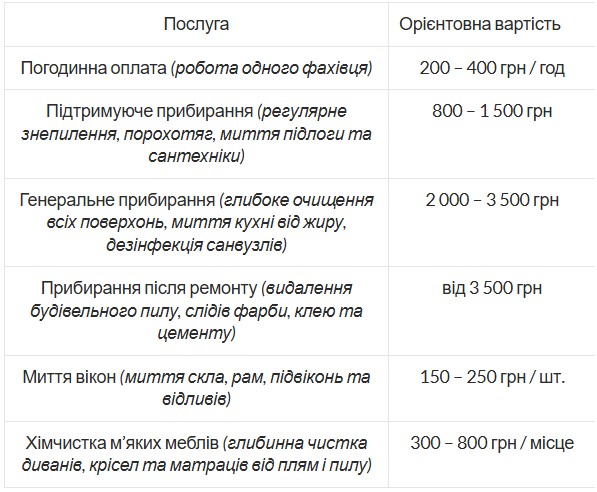 У середньому ціни варіюються від 200 до 400 грн за годину роботи одного фахівця, а комплексне прибирання квартир або офісів може коштувати від 800 до 3500 грн. На платформах зручно одразу порівняти ціни, обрати потрібну послугу і навіть замовити спеціаліста на конкретний день і час.