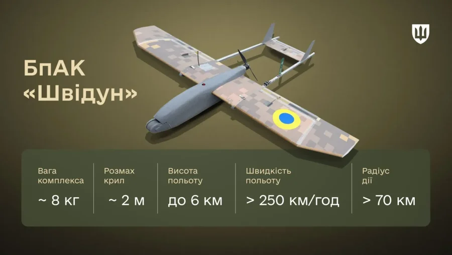 У Міноборони розповіли, що «Швідун» виготовлений із міцного композитного матеріалу, важить близько 8 кг і має розмах крил майже 2 метри. Безпілотник здатен підійматися на висоту до 6 км, розвивати швидкість понад 250 км/год і діяти на відстані більш як 70 км.