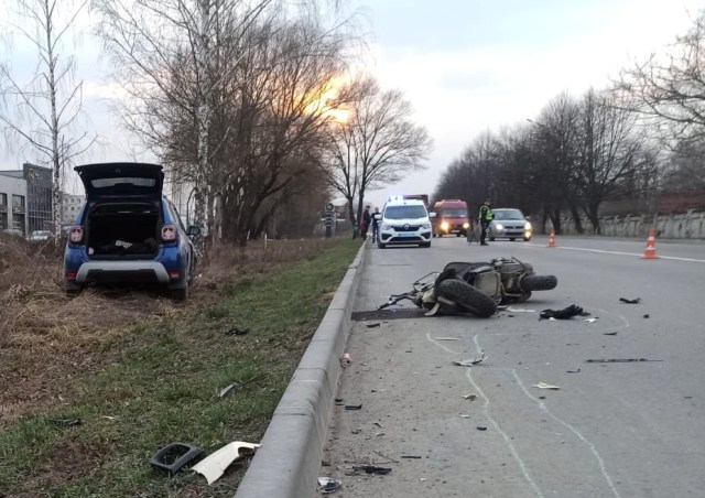 Як видно на фото, позашляховик вилетів на узбіччя, у нього пошкоджена передня частина та є вм’ятина на капоті. Ймовірно, мотоцикліт влетів у «лоб» машини.