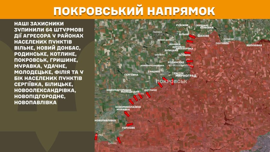 На Покровському напрямку наші захисники зупинили 64 штурмові дії агресора у районах населених пунктів Вільне, Новий Донбас, Родинське, Котлине, Покровськ, Гришине, Муравка, Удачне, Молодецьке, Філія та у бік населених пунктів Сергіївка, Білицьке, Новоолександрівка, Новопідгороднє, Новопавлівка.