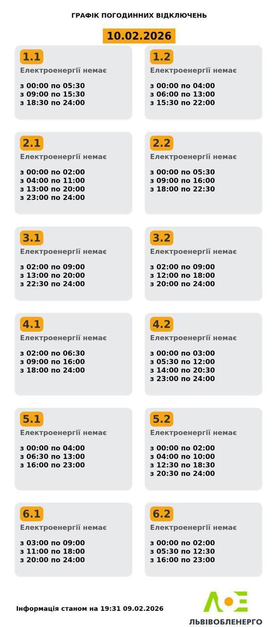 Поділитись У Львівобленерго повідомили графіки вимкнення світла на вівторок, 10 лютого. Електрику так само як і в понеділок, вимикатимуть майже по 20 годин на добу. Втім, вже від середи, 11 […]