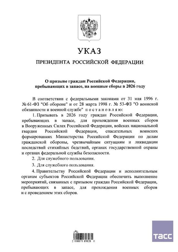 «Призивати в 2026 році громадян російської федерації, які перебувають у запасі, для проходження військових зборів», — йдеться в указі диктатора.