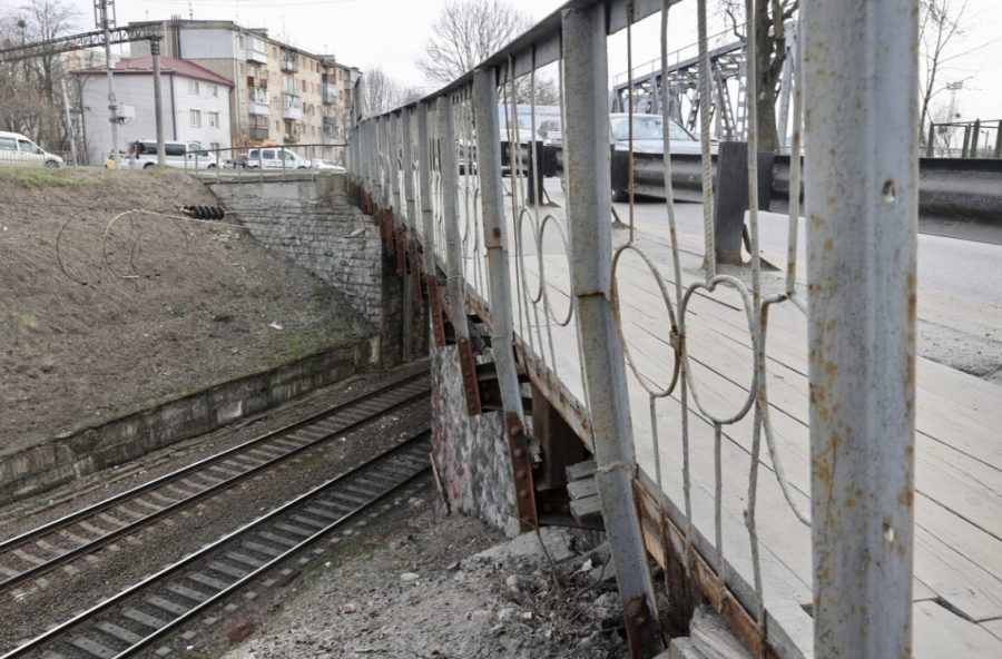 Металевий шляхопровід з кам’яними опорами на вул. О. Ковча був побудований в 1888 р. Довжина мосту 28,5 м. Під мостом проходять 2 залізничні колії. Перші ознаки деформації кладки стояків моста були зафіксовані ще у 1960 році: у кладці зворотних стін з’явилися тріщини через збільшення постійного навантаження. У 1974 року розкриття тріщин становило 4 мм, у 1982 році – 20 мм на лівому стояці та 12 мм на правому. З 2000 р розпочалася активізація розвитку тріщин.