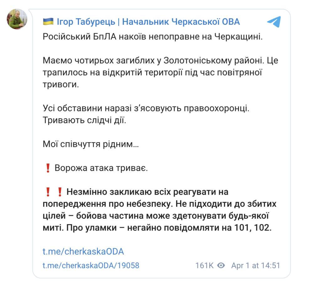 Маємо чотирьох загиблих у Золотоніському районі. Це трапилось на відкритій території під час повітряної тривоги.