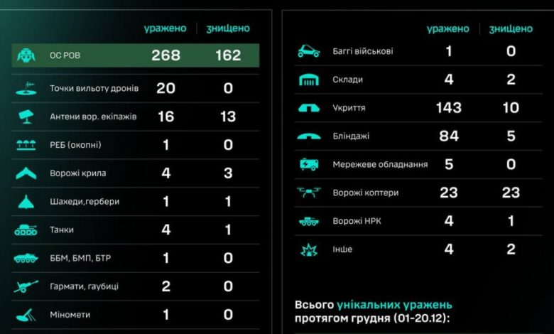 Загалом упродовж грудня (01–20.12) знищено/уражено 20353 цілей, з них 7974 — особовий склад противника.